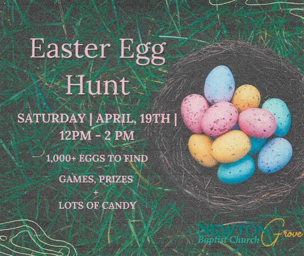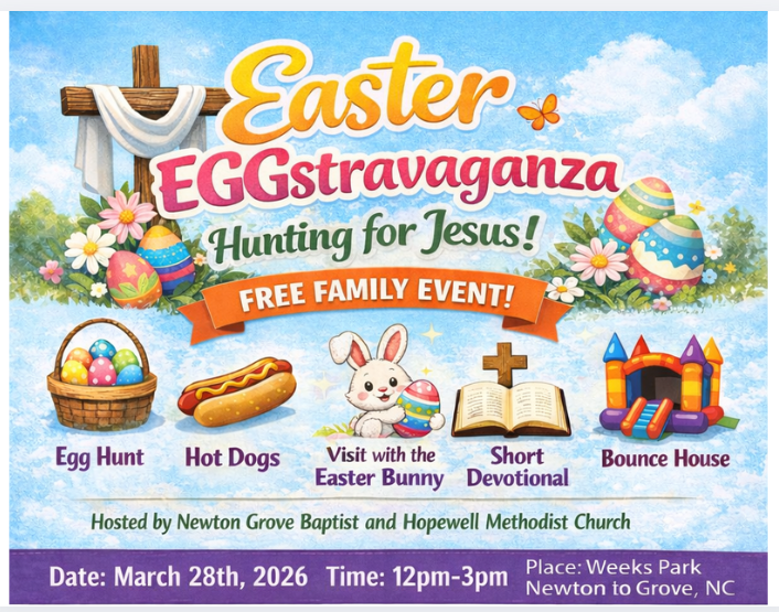 WHAT: Easter EGGstravaganza Hunting For Jesus! WHEN: March 28th, Saturday from 12-3pm WHERE: Weeks Park, Newton Grove NC HOSTED BY: Newton Grove Baptist Church and Hopewell Methodist Church Join us for the egg hunt, lunch, visit with the Easter Bunny, short Devotional, and Bouncy House! |
