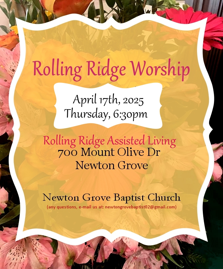 We will be visiting the residents of Rolling Ridge Assisted Living on April 17th, Thursday at 6:30pm. We will have a short Worship service and singing with the Choir. See you then.