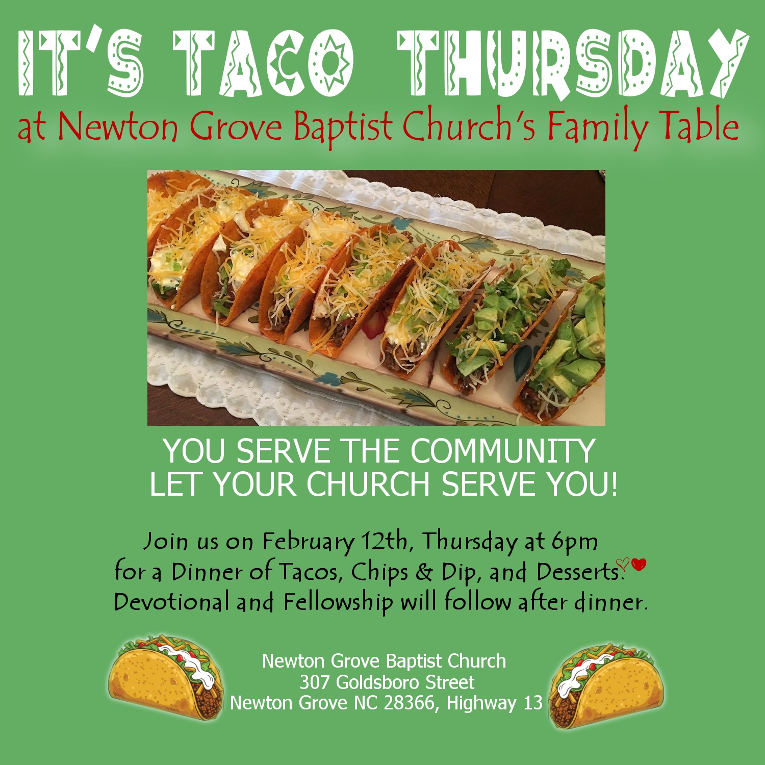 It's TACO THURSDAY at NGBC this Thursday, February 12th at 6pm. Join us for a dinner of tacos, chips & dip, and Valentine's Day Desserts. Devotional will follow after Dinner. YOU SERVE THE COMMUNITY - LET THE CHURCH SERVE YOU! |