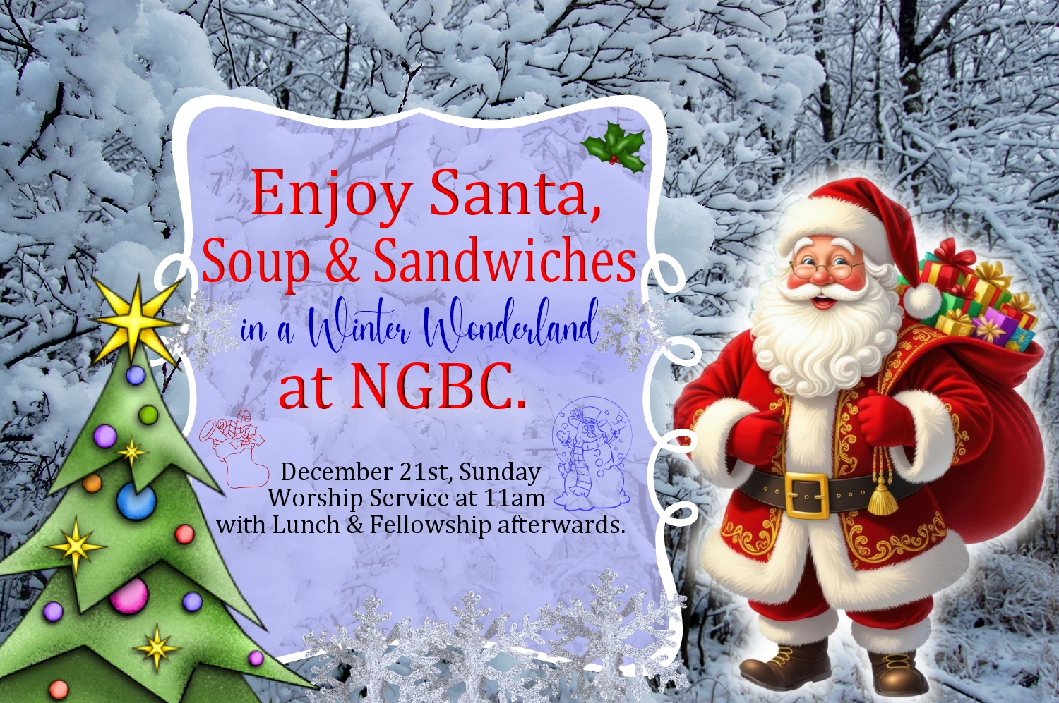 Come join us on December 21st for our Christmas Worship service at 11am and hope you stay for Soup & Sandwiches Lunch and Fellowship right after. |