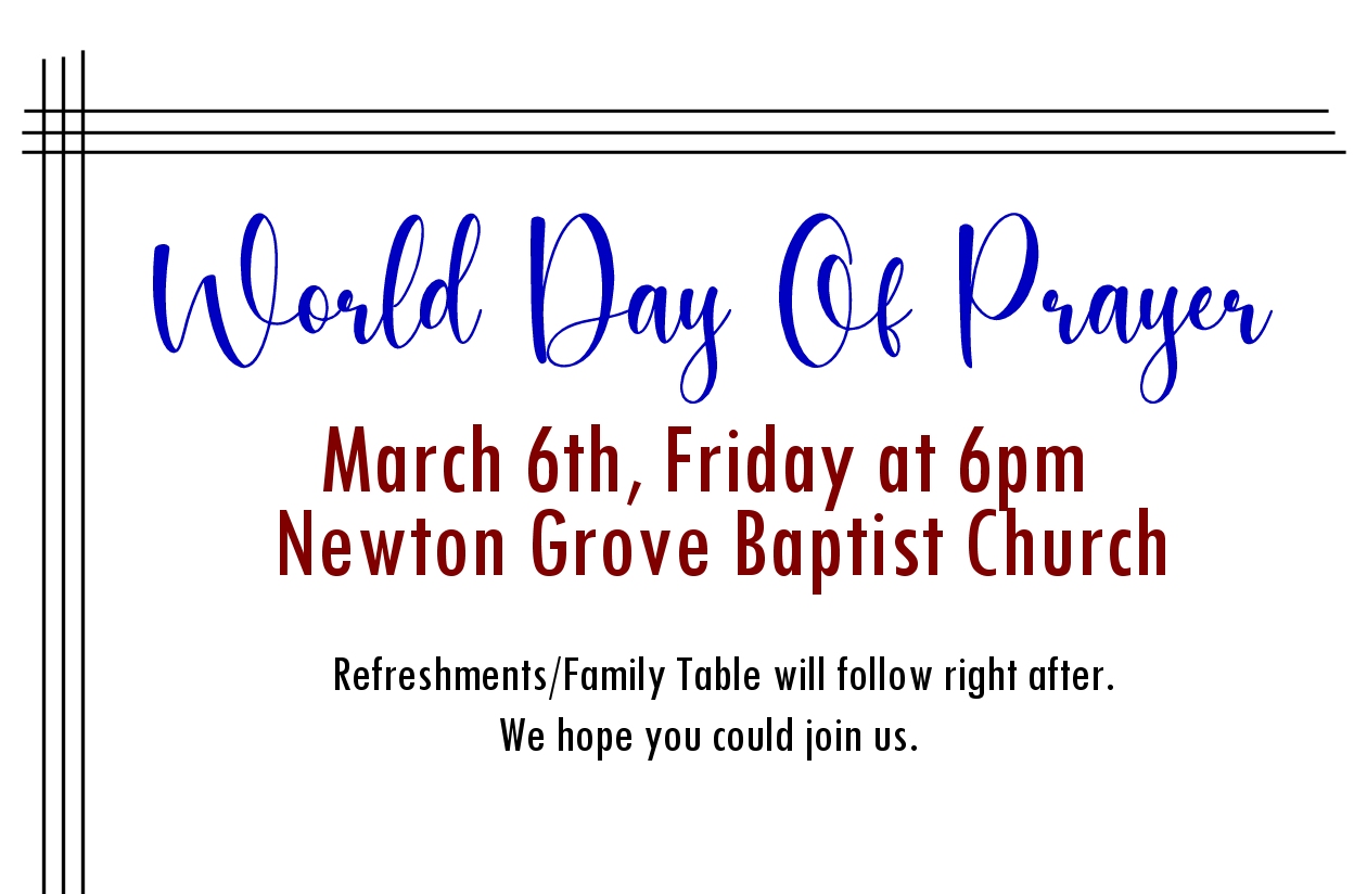 Newton Grove Baptist Church is inviting other Churches and parishioners in the community and towns nearby for World Day of Prayer on March 6th, Friday at 6pm. Church representatives are welcome to come up and say a prayer. Depending on the weather, it will be held outside(chairs will be provided) or Inside. Refreshments will follow right after. We hope you could join us. Any questions please email us at newtongrovebaptist02@gmail.com. |